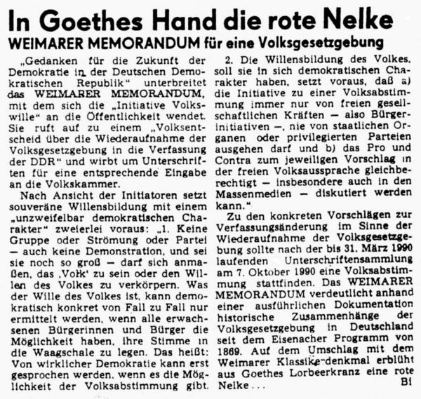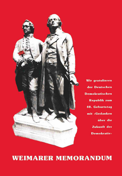 Vorbereitet war diese Aufklärung mit dem »Weimarer Memorandum«. Dieses sollte am 17. Juni 1989, dem 200. Jahrestag der Erklärung des »Dritten Standes« zur Nation in Frankreich, von Weimar aus eine Bürgerschaftsbewegung zum 40. Geburtstag der DDR anstoßen [siehe Weimarer Memorandum] – parallel zu jener an den Bundestag gerichteten Petition zum 40. Geburtstag der BRD am 23. Mai [siehe Achberger Memorandum]. Infolge einer Intrige kam das Memorandum leider erst am 22. November 1989 [siehe Bild: »In Goethes Hand die rote Nelke«] zum Einsatz, als die Weichen der Entwicklung in der DDR, ohne dass das Bewusstsein von der Volkssouveränität geweckt gewesen wäre, emotional schon ganz und gar in jene Richtung gestellt waren, wie es sich dann definitiv am 9. November manifestierte – weil die begriffliche Erscheinungsform der Idee, wie sie